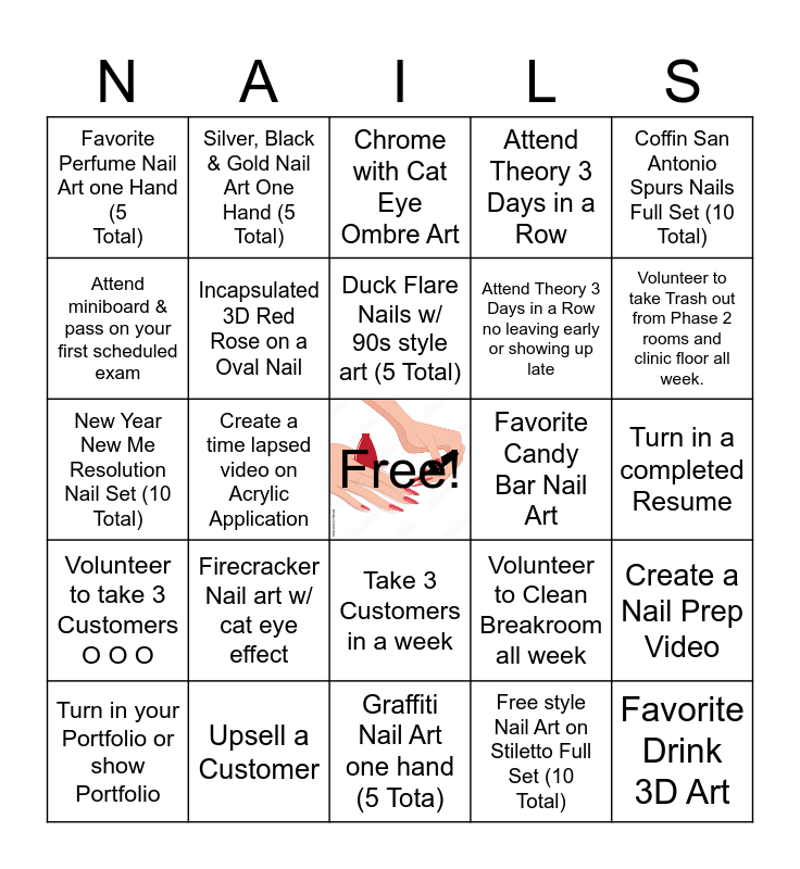 This bingo card has a free space and 24 words: Firecracker Nail art w/ cat eye effect, Upsell a Customer, Duck Flare Nails w/ 90s style art (5 Total), Turn in your Portfolio or show Portfolio, Coffin San Antonio Spurs Nails Full Set (10 Total), Favorite Perfume Nail Art one Hand (5 Total), Attend miniboard & pass on your first scheduled exam, Silver, Black & Gold Nail Art One Hand (5 Total), Favorite Candy Bar Nail Art, Take 3 Customers in a week, Attend Theory 3 Days in a Row no leaving early or showing up late, New Year New Me Resolution Nail Set (10 Total), Volunteer to Clean Breakroom all week, Create a Nail Prep Video, Incapsulated 3D Red Rose on a Oval Nail, Free style Nail Art on Stiletto Full Set (10 Total), Turn in a completed Resume, Chrome with Cat Eye Ombre Art, Volunteer to take Trash out from Phase 2 rooms and clinic floor all week., Create a time lapsed video on Acrylic Application, Favorite Drink 3D Art, Volunteer to take 3 Customers O O O, Attend Theory 3 Days in a Row and Graffiti Nail Art one hand (5 Tota).