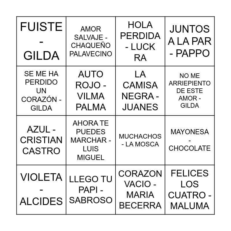 This bingo card has 80 words: UN SIGLO SIN TI - CHAYANNE, SINVERGUENZA - ANGELA LEIVA, HOLA PERDIDA - LUCK RA, UN FINDE - KE PERSONAJES, UNIVERSO PARALELO - LA KONGA, INTENTO - ULISES BUENO, LA MOROCHA - LUCK RA, TE AMO - FER VAZQUEZ, Free!, LO MEJOR DEL AMOR - RODRIGO, SOY CORDOBES - RODRIGO, BOMBÓN ASESINO - LOS PALMERAS, FUISTE - GILDA, AMOR SALVAJE - CHAQUEÑO PALAVECINO, A DON ATA - LA SOLE, JUNTOS A LA PAR - PAPPO, MI ENFERMEDAD - FABIANA CANTILO, LLEGO TU PAPI - SABROSO, BESO A BESO - LA MONA, QUIEN SE HA TOMADO TODO EL VINO - LA MONA, PROVOCAME - CHAYANNE, AHORA TE PUEDES MARCHAR - LUIS MIGUEL, MUCHACHOS - LA MOSCA, NO ME ARRIEPIENTO DE ESTE AMOR - GILDA, SE ME HA PERDIDO UN CORAZÓN - GILDA, NUNCA ME FALTES - ANTONIO RIOS, YA ME ESTOY ENAMORANDO - ANTONIO RIOS, YA ME ENTERÉ - LA KONGA, FUISTE TU - ARJONA, MUJERES - ARJONA, LA CAMISA NEGRA - JUANES, PEGA LA VUELTA - PIMPINELA, LA MORDIDITA - RICKY MARTIN, LA BICICLETA - CARLOS VIVES, CON LA MISMA MONEDA - KARINA, SIN CADENAS - LOS PERICOS, NADIE ES PERFECTO - LOS CALIGARIS, ENTRE A MI PAGO SIN GOLPEAR - LA SOLE, SOY SABALERO - LOS PALMERAS, FELICES LOS CUATRO - MALUMA, DESPACITO - LUIS FONSI, POR AMARTE ASI - CRISTIAN CASTRO, UNA CALLE NOS SEPARA - NESTOR EN BLOQUE, LA CHICA DEL BIKINI AZUL - LUIS MIGUEL, DEJA DE LLORAR - EL POLACO, AUTO ROJO - VILMA PALMA, NADA FUE UN ERROR - COTI, DESPUES DE TI - LEO MATIOLI, AVANTI MOROCHA - LOS CABALLEROS DE LA QUEMA, LA VENTANITA - GRUPO SOMBRAS, CORAZON MENTIROSO - KARINA, MAYONESA - CHOCOLATE, VIOLETA - ALCIDES, LA PACHANGA - VILMA PALMA, MENTIROSA - RAFAGA, AI SE EU TE PEGO - MICHEL TELO, CUANDO CALIENTA EL SOL - LUIS MIGUEL, SERA QUE NO ME AMAS - LUIS MIGUEL, MENEAITO - GABY, LLOVIENDO ESTRELLAS - CRISTIAN CASTRO, AZUL - CRISTIAN CASTRO, TE QUIERO TANTO - SERGIO DENIS, CORAZON CONTENTO - PALITO ORTEGA, YO TENGO FE - PALITO ORTEGA, DESPEINADA - PALITO ORTEGA, TIRITANDO - DONALD, ZAPATOS ROTOS - LOS NAUFRAGOS, FELIZ NAVIDAD - JOSE FELICIANO, JINGLE BELL - BOBBY HELMS, AMOR DE VAGO - LA T Y LA M, CORAZON VACIO - MARIA BECERRA, TODOS TENEMOS UN AMOR - LA MOSCA, PAPARAZZI - LADY GAGA, BABY ONE MORE TIME - BRITNEY, BEAT IT - MICHAEL JACKSON, CARELESS WHISPER - GEORGE MICHAEL, I WANT TO BREAK FREE - QUEEN, SIN SENTIMIENTOS - DREFQUILA, AMIGO - ROBERTO CARLOS and LAS MUEJERES FACTURAN - SHAKIRA.