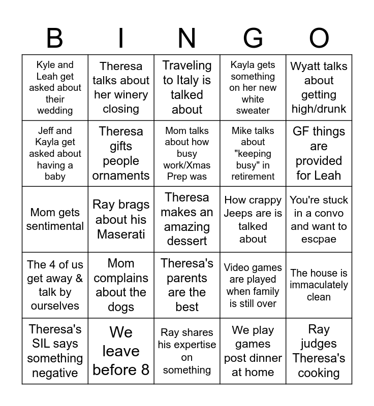 This bingo card has 25 words: Mom complains about the dogs, Ray shares his expertise on something, Mom talks about how busy work/Xmas Prep was, Theresa's SIL says something negative, Wyatt talks about getting high/drunk, Kyle and Leah get asked about their wedding, Jeff and Kayla get asked about having a baby, Theresa talks about her winery closing, How crappy Jeeps are is talked about, Theresa's parents are the best, Mike talks about "keeping busy" in retirement, Mom gets sentimental, Video games are played when family is still over, The house is immaculately clean, Theresa gifts people ornaments, Ray judges Theresa's cooking, You're stuck in a convo and want to escpae, Traveling to Italy is talked about, GF things are provided for Leah, Ray brags about his Maserati, Theresa makes an amazing dessert, We leave before 8, The 4 of us get away & talk by ourselves, Kayla gets something on her new white sweater and We play games post dinner at home.