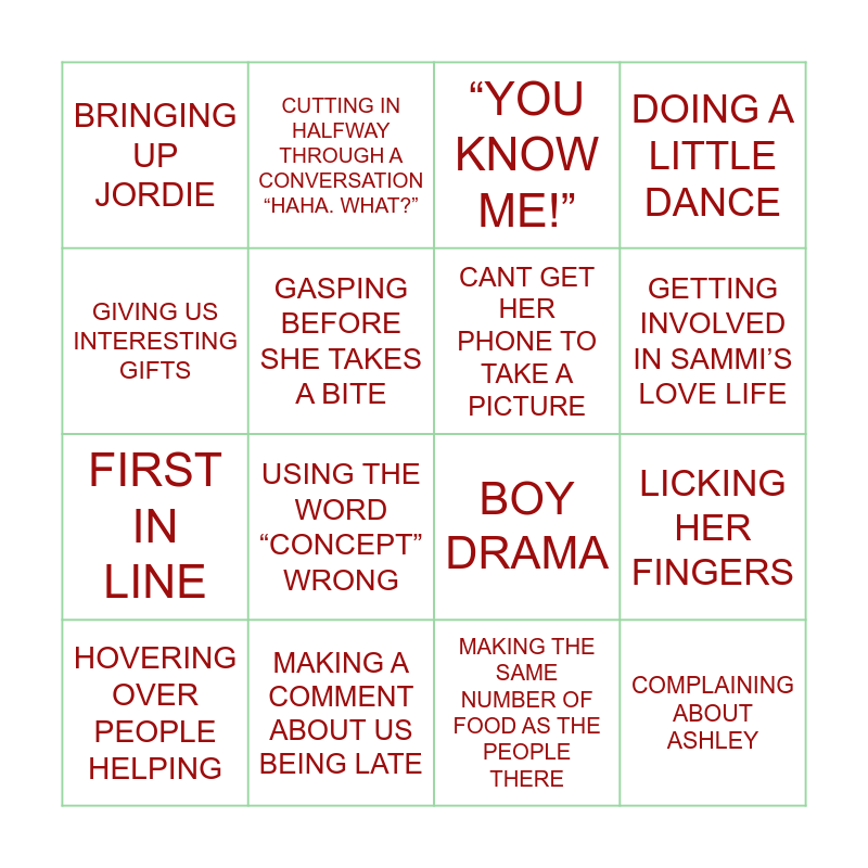 This bingo card has 16 words: MAKING A COMMENT ABOUT US BEING LATE, LICKING HER FINGERS, “YOU KNOW ME!”, BRINGING UP JORDIE, FIRST IN LINE, CUTTING IN HALFWAY THROUGH A CONVERSATION “HAHA. WHAT?”, BOY DRAMA, MAKING THE SAME NUMBER OF FOOD AS THE PEOPLE THERE, GIVING US INTERESTING GIFTS, GASPING BEFORE SHE TAKES A BITE, HOVERING OVER PEOPLE HELPING, DOING A LITTLE DANCE, USING THE WORD “CONCEPT” WRONG, GETTING INVOLVED IN SAMMI’S LOVE LIFE, CANT GET HER PHONE TO TAKE A PICTURE and COMPLAINING ABOUT ASHLEY.