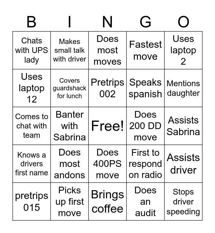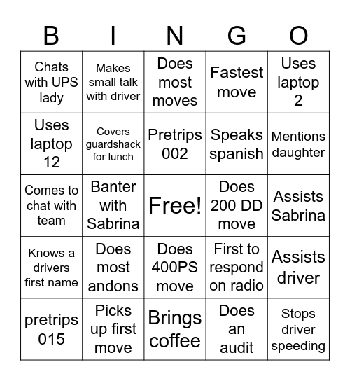 This bingo card has a free space and 24 words: Does most andons, Picks up first move, Pretrips 002, pretrips 015, Uses laptop 2, Chats with UPS lady, Uses laptop 12, Makes small talk with driver, Does 200 DD move, Does 400PS move, Speaks spanish, Comes to chat with team, First to respond on radio, Assists driver, Covers guardshack for lunch, Does an audit, Assists Sabrina, Does most moves, Mentions daughter, Banter with Sabrina, Stops driver speeding, Knows a drivers first name, Fastest move and Brings coffee.