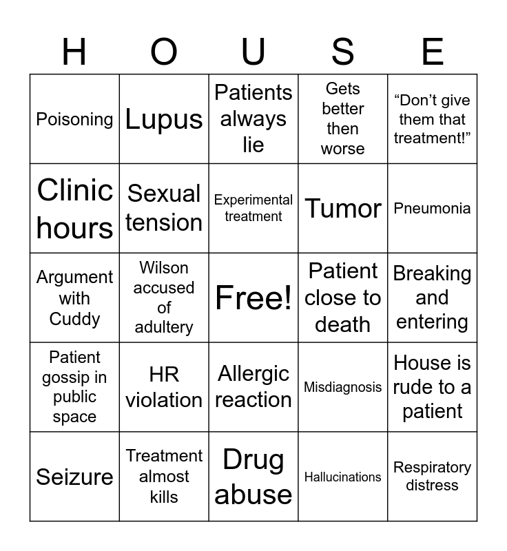 This bingo card has a free space and 43 words: Stroke, Respiratory distress, Blood clot, Seizure, Panic attack, Hallucinations, Patients always lie, MRI, “Don’t give them that treatment!”, Treatment almost kills, Gets better then worse, Patient close to death, Allergic reaction, HR violation, Medical malpractice, Drug abuse, Too young/old to have that, Argument with Cuddy, Cameron gets attached, Pneumonia, Lupus, Sarcoidosis, Cancer, Poisoning, Guess the patient in the intro, Breaking and entering, Hilson, Organ failure, Misdiagnosis, Patient gossip in public space, 2 diseases at once?, House is rude to a patient, Patient reads House, Wilson accused of adultery, Derogatory joke, Conflict of interest, Exam room one, Experimental treatment, Clinic hours, Tumor, Random epiphany, Sexual tension and Patient is comically stupid.