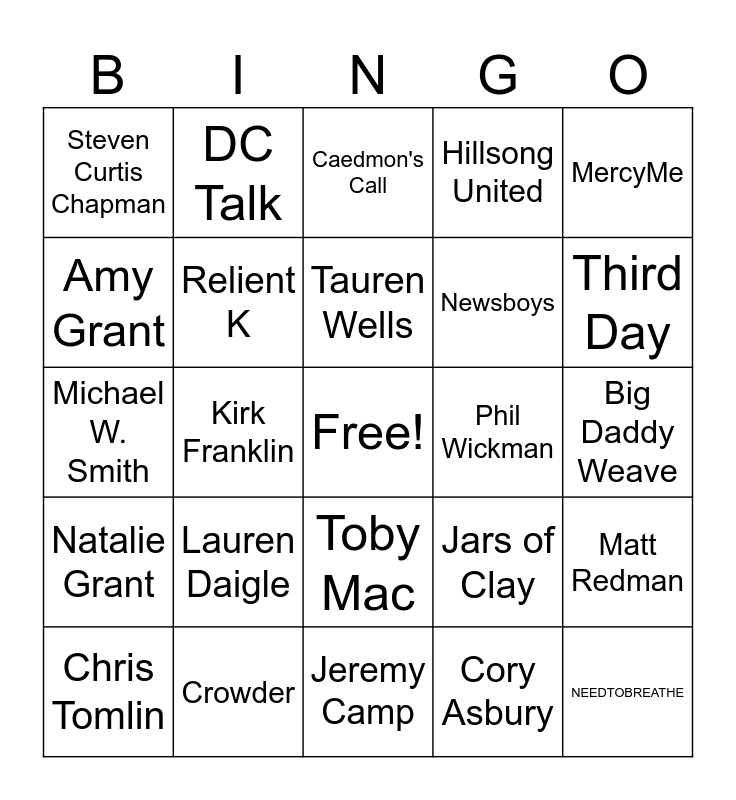This bingo card has a free space and 24 words: Lauren Daigle, Crowder, Tauren Wells, Chris Tomlin, MercyMe, Steven Curtis Chapman, Amy Grant, DC Talk, Phil Wickman, Toby Mac, Newsboys, Michael W. Smith, Jars of Clay, Matt Redman, Relient K, Cory Asbury, Big Daddy Weave, Caedmon's Call, Third Day, Kirk Franklin, NEEDTOBREATHE, Natalie Grant, Hillsong United and Jeremy Camp.