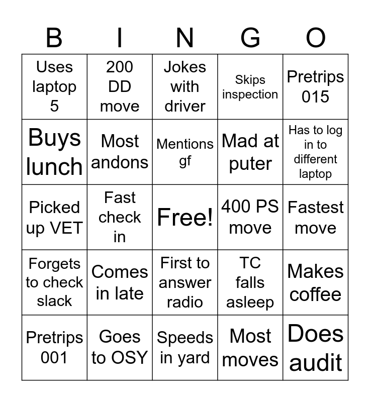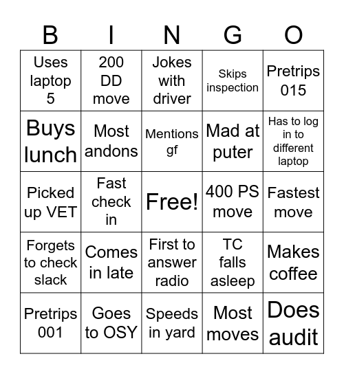 This bingo card has a free space and 24 words: Comes in late, Goes to OSY, Mentions gf, Pretrips 001, Pretrips 015, Uses laptop 5, Buys lunch, 200 DD move, 400 PS move, First to answer radio, Mad at puter, Picked up VET, TC falls asleep, Makes coffee, Most andons, Most moves, Fastest move, Jokes with driver, Has to log in to different laptop, Fast check in, Does audit, Forgets to check slack, Skips inspection and Speeds in yard.