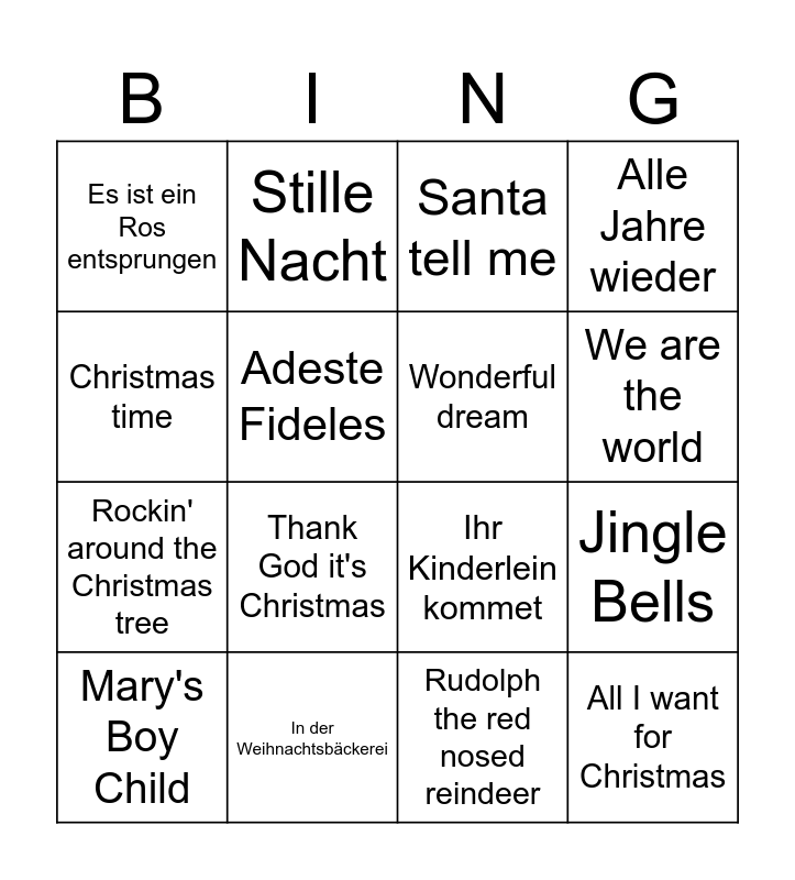 This bingo card has 29 words: Driving Home for christmas, Feliz navidad, Jingle Bells, O Tannenbaum, Es ist ein Ros entsprungen, Santa tell me, Wonderful dream, Last Christmas, In der Weihnachtsbäckerei, Underneath the tree, Rudolph the red nosed reindeer, Mary's Boy Child, Do they know it's Christmas?, Let it snow, Thank God it's Christmas, Schneeflöckchen Weißröckchen, O du fröhliche, All I want for Christmas, Christmas time, Ihr Kinderlein kommet, Hört der Engel helle Lieder, Lasst uns froh und munter sein, Rockin' around the Christmas tree, Adeste Fideles, Alle Jahre wieder, Stille Nacht, Merry Christmas, We are the world and Someday at Christmas.