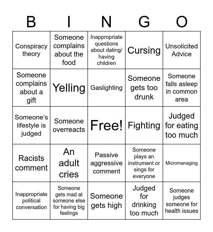 This bingo card has a free space and 24 words: An adult cries, Someone gets mad at someone else for having big feelings, Gaslighting, Inappropriate political conversation, Unsolicited Advice, Conspiracy theory, Someone complains about a gift, Someone complains about the food, Fighting, Passive aggressive comment, Someone gets too drunk, Someone’s lifestyle is judged, Someone plays an instrument or sings for everyone, Micromanaging, Yelling, Judged for drinking too much, Judged for eating too much, Inappropriate questions about dating/ having children, Someone falls asleep in common area, Someone overreacts, Someone judges someone for health issues, Racists comment, Cursing and Someone gets high.