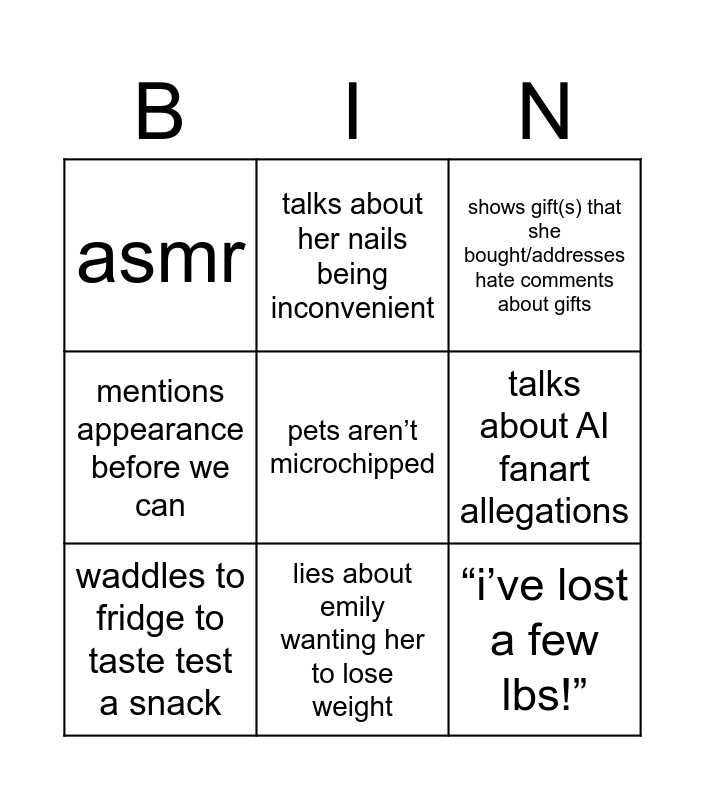 This bingo card has a free space and 8 words: talks about AI fanart allegations, shows gift(s) that she bought/addresses hate comments about gifts, talks about her nails being inconvenient, waddles to fridge to taste test a snack, asmr, “i’ve lost a few lbs!”, mentions appearance before we can and lies about emily wanting her to lose weight.