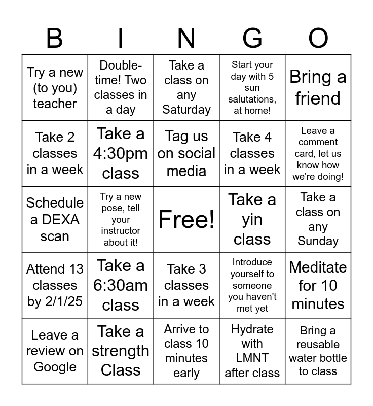 This bingo card has a free space and 24 words: Take a 6:30am class, Take a strength Class, Tag us on social media, Leave a review on Google, Bring a friend, Try a new (to you) teacher, Take 2 classes in a week, Double-time! Two classes in a day, Take a yin class, Take 3 classes in a week, Take 4 classes in a week, Schedule a DEXA scan, Introduce yourself to someone you haven't met yet, Meditate for 10 minutes, Take a 4:30pm class, Hydrate with LMNT after class, Take a class on any Sunday, Take a class on any Saturday, Leave a comment card, let us know how we're doing!, Try a new pose, tell your instructor about it!, Bring a reusable water bottle to class, Attend 13 classes by 2/1/25, Start your day with 5 sun salutations, at home! and Arrive to class 10 minutes early.