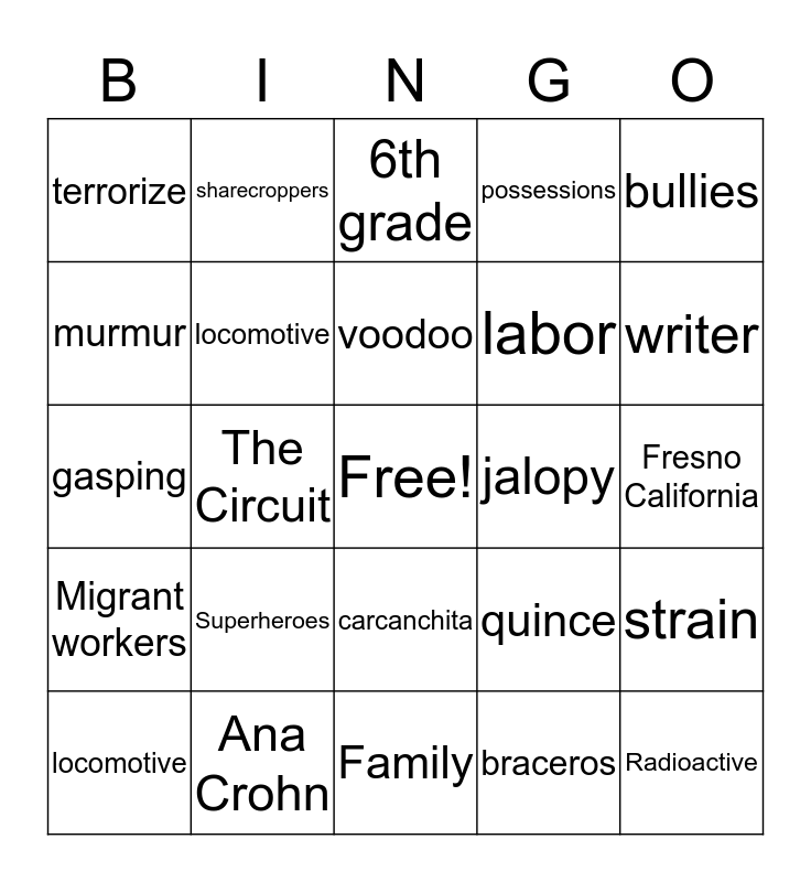 This bingo card has a free space and 24 words: Superheroes, Ana Crohn, voodoo, locomotive, bullies, terrorize, murmur, sharecroppers, jalopy, carcanchita, labor, gasping, quince, strain, locomotive, braceros, Fresno California, 6th grade, writer, The Circuit, Radioactive, Migrant workers, possessions and Family.