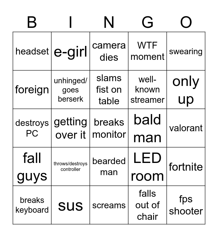 This bingo card has 25 words: throws/destroys controller, screams, slams fist on table, breaks keyboard, swearing, headset, foreign, e-girl, bald man, bearded man, well-known streamer, destroys PC, LED room, fortnite, unhinged/ goes berserk, fps shooter, valorant, camera dies, only up, getting over it, breaks monitor, sus, fall guys, WTF moment and falls out of chair.