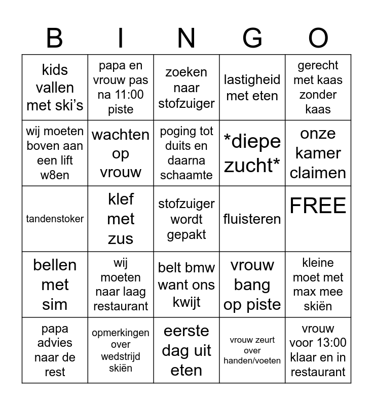 This bingo card has 36 words: Vrouw boos, Geforceerd om af te ruimen, rijdt 30 min niet 130+, wachten op vrouw, vrouw bang op piste, bellen met sim, poging tot duits en daarna schaamte, vrouw vraagt of het varken is, gerecht met kaas zonder kaas, drinkt drinken niet op in 30min, klef met zus, lastigheid met eten, kids met ons mee berg op, fluisteren, onze kamer claimen, kids vallen met ski’s, vrouw voor 13:00 klaar en in restaurant, wij moeten naar laag restaurant, stofzuiger wordt gepakt, zoeken naar stofzuiger, FREE, kleine moet met max mee skiën, opmerkingen over wedstrijd skiën, papa advies naar de rest, eerste dag uit eten, papa en vrouw pas na 11:00 piste, tandenstoker, vrouw met lift naar beneden, *diepe zucht*, wij moeten boven aan een lift w8en, commentaar als axel ski’s doet, awkward foto’s in groepsapp, vrouw zeurt over handen/voeten, belt bmw want ons kwijt, klein kind wilt in apres ski and moeten wachten op vrouw op piste.