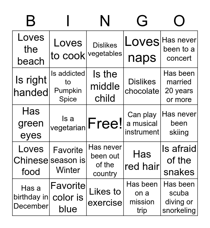 This bingo card has a free space and 24 words: Favorite season is Winter, Favorite color is blue, Is the middle child, Has a birthday in December, Has never been to a concert, Loves the beach, Is right handed, Loves to cook, Can play a musical instrument, Has never been out of the country, Dislikes chocolate, Has green eyes, Has red hair, Is afraid of the snakes, Is addicted to Pumpkin Spice, Has been on a mission trip, Has never been skiing, Dislikes vegetables, Has been married 20 years or more, Is a vegetarian, Has been scuba diving or snorkeling, Loves Chinese food, Loves naps and Likes to exercise.