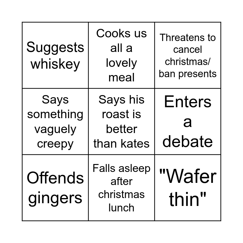 This bingo card has 17 words: "Loserrrr", Says what? Pretending he cant hear u when u mention his hearing, Threatens to cancel christmas/ ban presents, Suggests whiskey, Tears up, Says something vaguely creepy, Insinuates eve is dumb, Offends gingers, Falls asleep after christmas lunch, Enters a debate, Dansplains, Calls sprouts 'cow bogeys', Says his roast is better than kates, Cooks us all a lovely meal, "Wafer thin", Tells a story that happened to someone else and Blames/complains about game team.