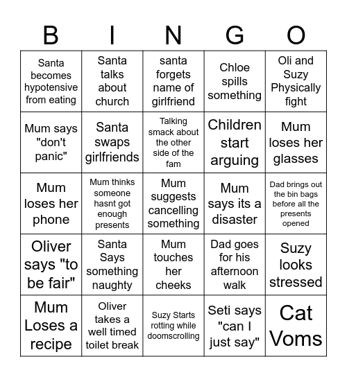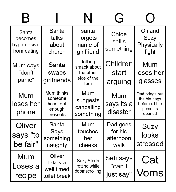 This bingo card has 25 words: Santa Says something naughty, Suzy Starts rotting while doomscrolling, Talking smack about the other side of the fam, Mum Loses a recipe, Oli and Suzy Physically fight, Santa becomes hypotensive from eating, Mum says "don't panic", Santa talks about church, Mum says its a disaster, Mum touches her cheeks, Children start arguing, Mum loses her phone, Dad goes for his afternoon walk, Suzy looks stressed, Santa swaps girlfriends, Cat Voms, Dad brings out the bin bags before all the presents opened, santa forgets name of girlfriend, Mum loses her glasses, Mum thinks someone hasnt got enough presents, Mum suggests cancelling something, Oliver takes a well timed toilet break, Oliver says "to be fair", Chloe spills something and Seti says "can I just say".