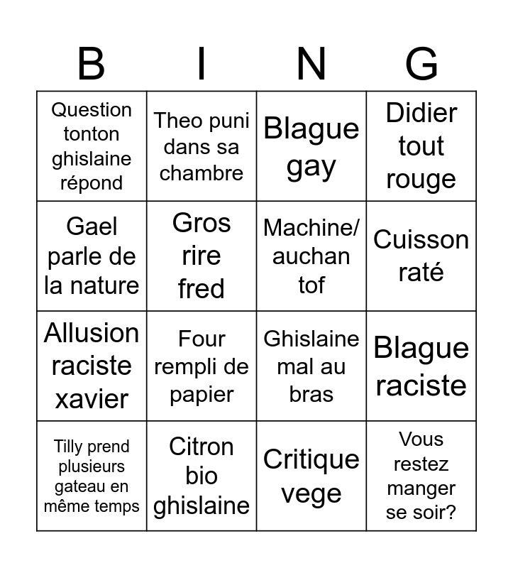 This bingo card has 16 words: Citron bio ghislaine, Blague raciste, Blague gay, Question tonton ghislaine répond, Allusion raciste xavier, Theo puni dans sa chambre, Ghislaine mal au bras, Critique vege, Gael parle de la nature, Gros rire fred, Tilly prend plusieurs gateau en même temps, Didier tout rouge, Four rempli de papier, Cuisson raté, Machine/ auchan tof and Vous restez manger se soir?.