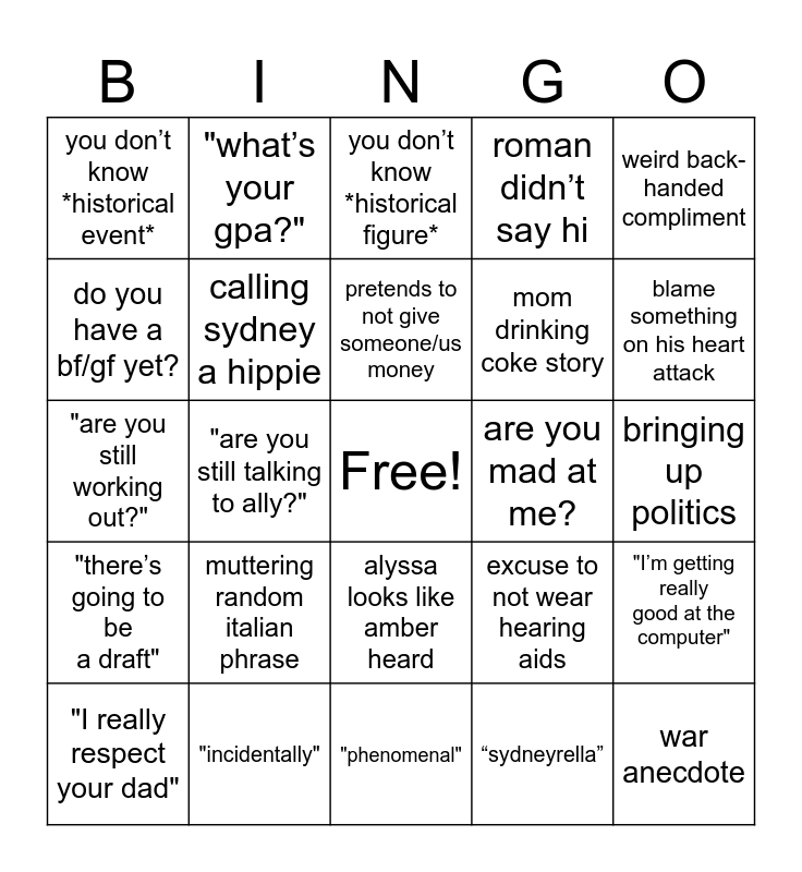 This bingo card has a free space and 24 words: muttering random italian phrase, "incidentally", pretends to not give someone/us money, "I really respect your dad", weird back-handed compliment, you don’t know *historical event*, do you have a bf/gf yet?, "what’s your gpa?", are you mad at me?, alyssa looks like amber heard, mom drinking coke story, "are you still working out?", excuse to not wear hearing aids, "I’m getting really good at the computer", calling sydney a hippie, “sydneyrella”, bringing up politics, you don’t know *historical figure*, blame something on his heart attack, "are you still talking to ally?", war anecdote, "there’s going to be a draft", roman didn’t say hi and "phenomenal".
