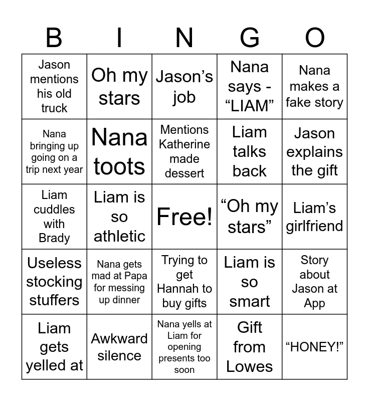 This bingo card has a free space and 24 words: Liam gets yelled at, Nana gets mad at Papa for messing up dinner, Mentions Katherine made dessert, Gift from Lowes, Nana makes a fake story, Jason mentions his old truck, Oh my stars, Jason’s job, “Oh my stars”, Liam’s girlfriend, Liam cuddles with Brady, Nana toots, Liam is so smart, Story about Jason at App, Nana bringing up going on a trip next year, Awkward silence, Nana yells at Liam for opening presents too soon, Nana says - “LIAM”, Jason explains the gift, Useless stocking stuffers, Liam is so athletic, Trying to get Hannah to buy gifts, Liam talks back and “HONEY!”.
