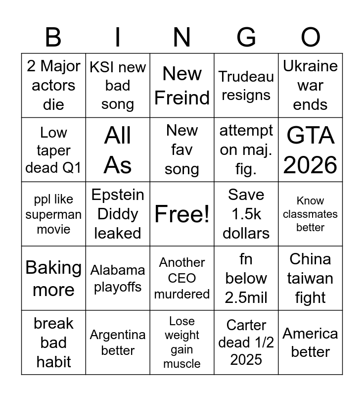 This bingo card has a free space and 24 words: Alabama playoffs, Argentina better, New fav song, break bad habit, Ukraine war ends, 2 Major actors die, Low taper dead Q1, KSI new bad song, Save 1.5k dollars, Another CEO murdered, attempt on maj. fig., ppl like superman movie, fn below 2.5mil, China taiwan fight, All As, Carter dead 1/2 2025, Know classmates better, New Freind, GTA 2026, Epstein Diddy leaked, America better, Baking more, Trudeau resigns and Lose weight gain muscle.
