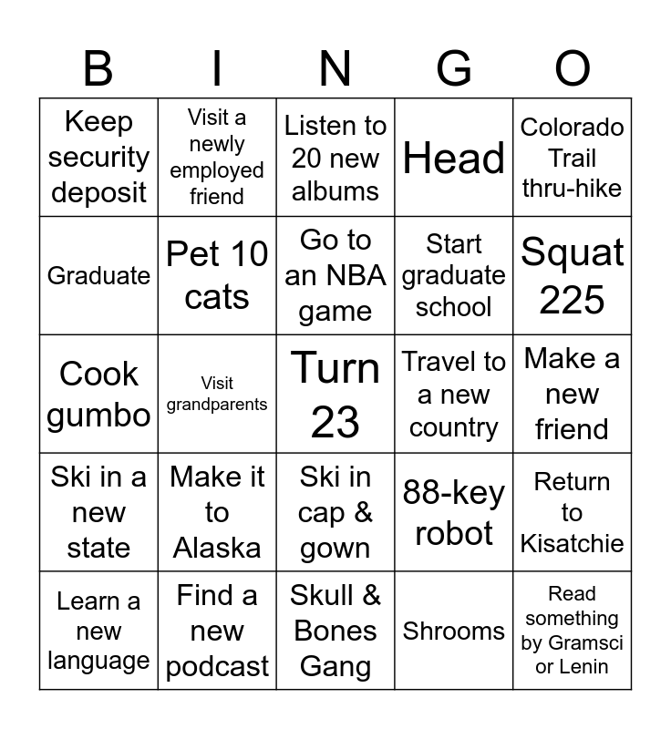 This bingo card has a free space and 24 words: Make it to Alaska, Find a new podcast, Go to an NBA game, Learn a new language, Colorado Trail thru-hike, Keep security deposit, Graduate, Visit a newly employed friend, Travel to a new country, Ski in cap & gown, Start graduate school, Cook gumbo, 88-key robot, Return to Kisatchie, Pet 10 cats, Shrooms, Make a new friend, Listen to 20 new albums, Squat 225, Visit grandparents, Read something by Gramsci or Lenin, Ski in a new state, Head and Skull & Bones Gang.