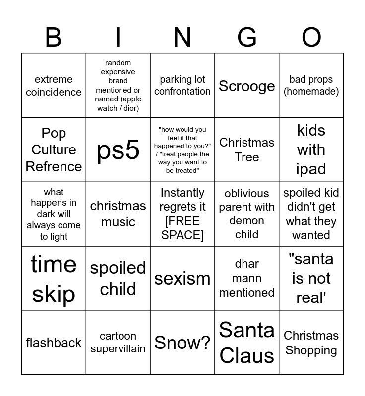 This bingo card has a free space and 34 words: dhar mann voiceover, Santa Claus, "you see" / "so you see", merch in video, time skip, ps5, bad props (homemade), flashback, random expensive brand mentioned or named (apple watch / dior), dhar mann studios office in the video, "how would you feel if that happened to you?" / "treat people the way you want to be treated", parking lot confrontation, Poor person, Caroling, oblivious parent with demon child, kids with ipad, cartoon supervillain, what happens in dark will always come to light, spoiled child, dhar mann mentioned, sexism, someone fired over something small, extreme coincidence, spoiled kid didn't get what they wanted, Snow?, Christmas Shopping, Scrooge, Chirstmas movie in the backgorund, Christmas Tree, Pop Culture Refrence, Rich person, christmas music, "santa is not real' and "You ruined Christmas".