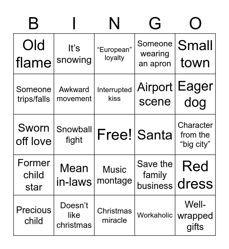 This bingo card has a free space and 24 words: Precious child, Mean in-laws, Interrupted kiss, Workaholic, Small town, Old flame, It’s snowing, “European” loyalty, Santa, Character from the “big city”, Sworn off love, Awkward movement, Save the family business, Red dress, Someone trips/falls, Doesn’t like christmas, Christmas miracle, Someone wearing an apron, Eager dog, Former child star, Snowball fight, Music montage, Airport scene and Well-wrapped gifts.