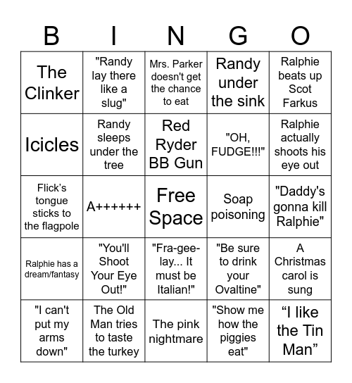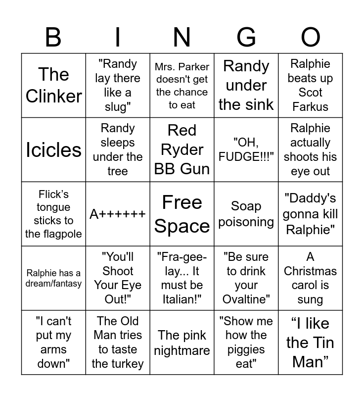This bingo card has a free space and 29 words: "I can't put my arms down", Yellow eyes, A++++++, The Bumpuss Hounds, The Clinker, Mrs. Parker doesn't get the chance to eat, Randy sleeps under the tree, "You'll Shoot Your Eye Out!", Soap poisoning, The Old Man tries to taste the turkey, "Daddy's gonna kill Ralphie", “I like the Tin Man”, The pink nightmare, "Show me how the piggies eat", Ralphie actually shoots his eye out, Mrs. Parker tries to turn off the lamp, "Fra-gee-lay... It must be Italian!", Ralphie has a dream/fantasy, Ralphie beats up Scot Farkus, Flick’s tongue sticks to the flagpole, "Be sure to drink your Ovaltine", Bad Santa, "OH, FUDGE!!!", Icicles, Randy under the sink, "Randy lay there like a slug", A Christmas carol is sung, Red Ryder BB Gun and “You used up all the glue on purpose!”.