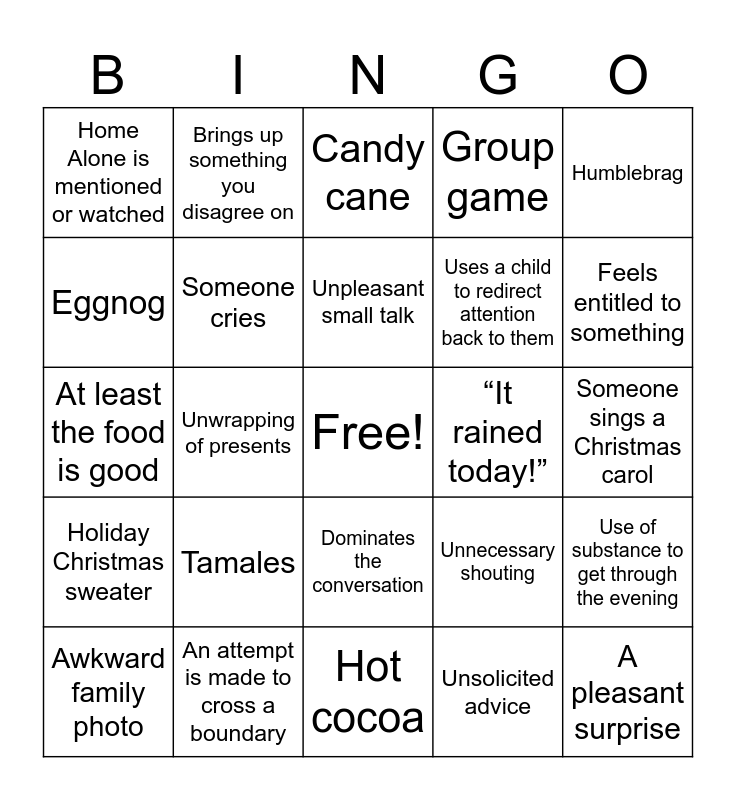 This bingo card has a free space and 24 words: Tamales, An attempt is made to cross a boundary, Unpleasant small talk, Awkward family photo, Humblebrag, Home Alone is mentioned or watched, Eggnog, Brings up something you disagree on, “It rained today!”, Dominates the conversation, Uses a child to redirect attention back to them, At least the food is good, Unnecessary shouting, Use of substance to get through the evening, Someone cries, Unsolicited advice, Someone sings a Christmas carol, Candy cane, Feels entitled to something, Unwrapping of presents, A pleasant surprise, Holiday Christmas sweater, Group game and Hot cocoa.