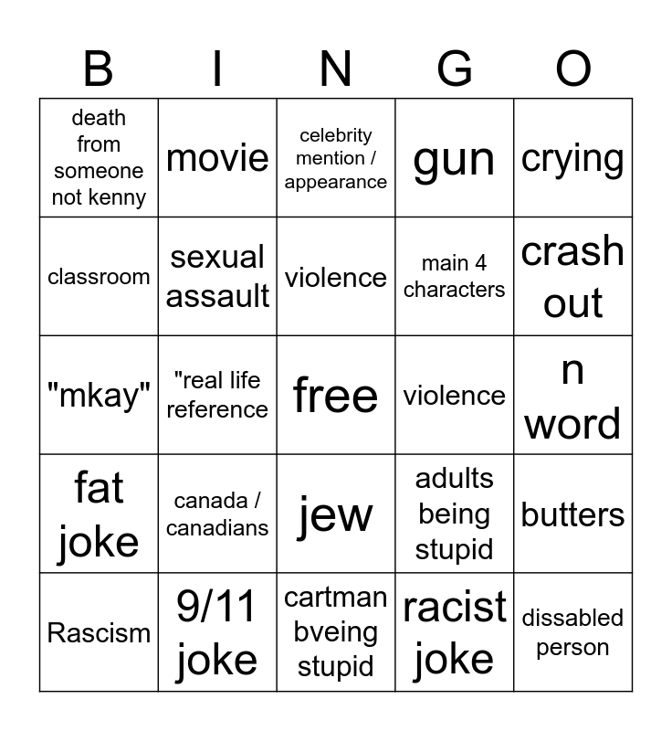 This bingo card has a free space and 29 words: Rascism, singing, "real life reference, real life event, death from someone not kenny, celebrity mention / appearance, sexual assault, canada / canadians, violence, 9/11 joke, n word, dissabled person, cartman bveing stupid, racist joke, crash out, sexism, jew, fat joke, crying, "mkay", adults being stupid, fighting, main 4 characters, classroom, gun, movie, butters, violence and kenny dead.
