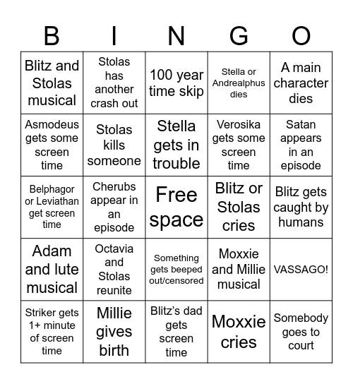 This bingo card has a free space and 24 words: Octavia and Stolas reunite, Millie gives birth, Stella gets in trouble, Striker gets 1+ minute of screen time, A main character dies, Blitz and Stolas musical, Asmodeus gets some screen time, Stolas has another crash out, Blitz or Stolas cries, Something gets beeped out/censored, Verosika gets some screen time, Belphagor or Leviathan get screen time, Moxxie and Millie musical, VASSAGO!, Stolas kills someone, Moxxie cries, Blitz gets caught by humans, 100 year time skip, Satan appears in an episode, Cherubs appear in an episode, Somebody goes to court, Adam and lute musical, Stella or Andrealphus dies and Blitz’s dad gets screen time.