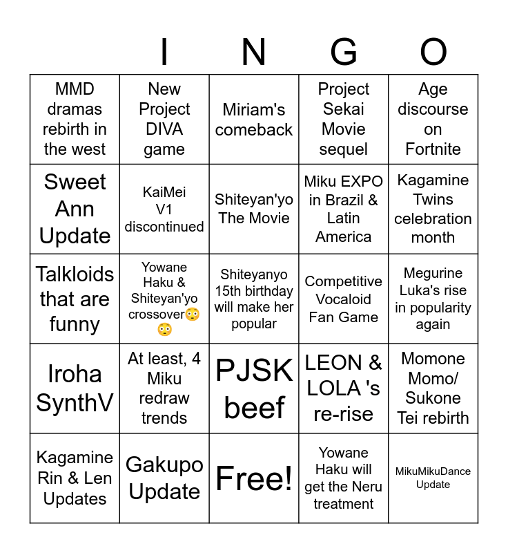 This bingo card has 25 words: Iroha SynthV, Gakupo Update, Shiteyanyo 15th birthday will make her popular, Yowane Haku will get the Neru treatment, Age discourse on Fortnite, MMD dramas rebirth in the west, New Project DIVA game, Miriam's comeback, Competitive Vocaloid Fan Game, Momone Momo/ Sukone Tei rebirth, Sweet Ann Update, KaiMei V1 discontinued, Free!, LEON & LOLA 's re-rise, Kagamine Twins celebration month, Kagamine Rin & Len Updates, Yowane Haku & Shiteyan'yo crossover😳😳, Shiteyan'yo The Movie, Miku EXPO in Brazil & Latin America, Megurine Luka's rise in popularity again, Talkloids that are funny, At least, 4 Miku redraw trends, PJSK beef, Project Sekai Movie sequel and MikuMikuDance Update.