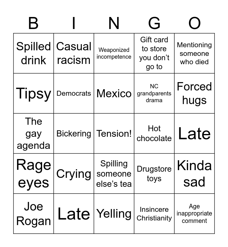 This bingo card has a free space and 24 words: Crying, Late, Mexico, Joe Rogan, Mentioning someone who died, Spilled drink, Tipsy, Casual racism, Hot chocolate, Spilling someone else’s tea, NC grandparents drama, The gay agenda, Drugstore toys, Kinda sad, Democrats, Insincere Christianity, Late, Weaponized incompetence, Forced hugs, Bickering, Age inappropriate comment, Rage eyes, Gift card to store you don’t go to and Yelling.