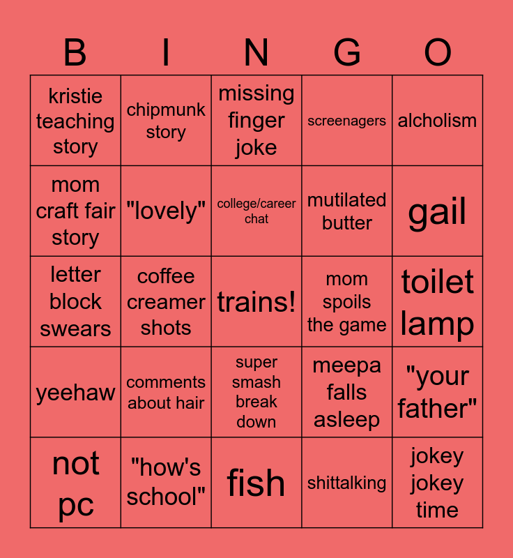 This bingo card has a free space and 24 words: comments about hair, "how's school", college/career chat, not pc, alcholism, kristie teaching story, mom craft fair story, chipmunk story, mom spoils the game, super smash break down, mutilated butter, letter block swears, meepa falls asleep, "your father", "lovely", shittalking, toilet lamp, missing finger joke, gail, coffee creamer shots, jokey jokey time, yeehaw, screenagers and fish.