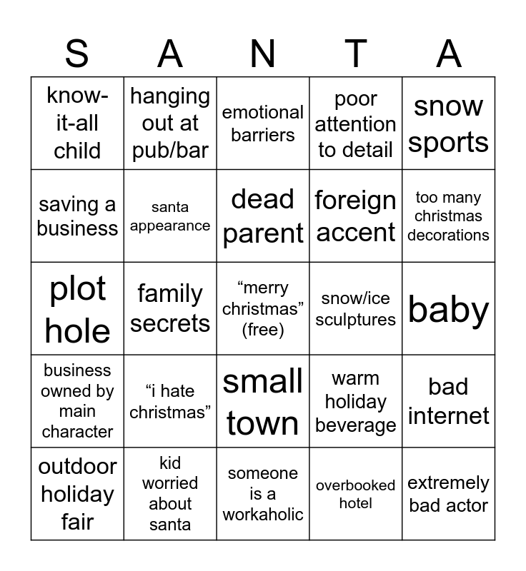 This bingo card has a free space and 39 words: separating eggs, hotel/inn, contest, santa appearance, outdoor holiday fair, small town, dead parent, side characters fall in love, snow sports, business owned by main character, family secrets, poor attention to detail, extremely bad actor, baby, snow/ice sculptures, “i hate christmas”, whole town is there, know-it-all child, incognito, warm holiday beverage, saving a business, someone is a workaholic, foreign accent, too many christmas decorations, kindly old person, storm/power outage, disabled kid, divorce/breakup, baking christmas cookies, hanging out at pub/bar, international travel, carolers, emotional barriers, kid worried about santa, overbooked hotel, taxi, bad internet, plot hole and interrupted kiss.