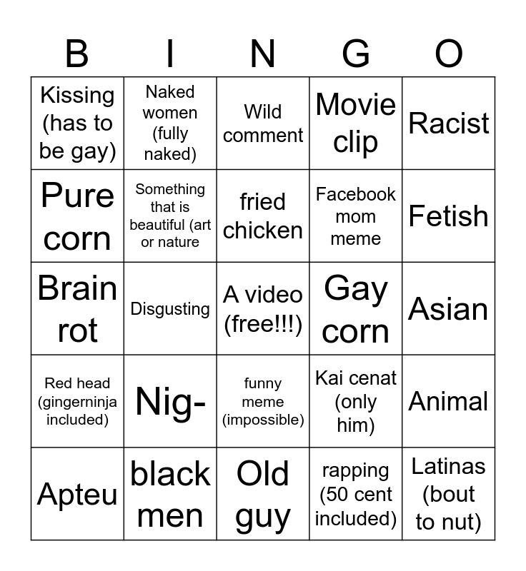This bingo card has a free space and 24 words: Nig-, black men, fried chicken, Apteu, Racist, Kissing (has to be gay), Pure corn, Naked women (fully naked), Gay corn, funny meme (impossible), Facebook mom meme, Brain rot, Kai cenat (only him), Animal, Something that is beautiful (art or nature, rapping (50 cent included), Asian, Wild comment, Fetish, Disgusting, Latinas (bout to nut), Red head (gingerninja included), Movie clip and Old guy.