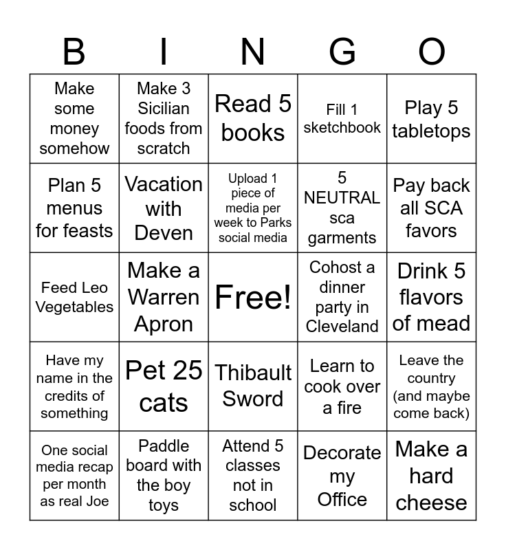 This bingo card has a free space and 24 words: Pet 25 cats, Paddle board with the boy toys, Upload 1 piece of media per week to Parks social media, One social media recap per month as real Joe, Play 5 tabletops, Make some money somehow, Plan 5 menus for feasts, Make 3 Sicilian foods from scratch, Cohost a dinner party in Cleveland, Thibault Sword, 5 NEUTRAL sca garments, Feed Leo Vegetables, Learn to cook over a fire, Leave the country (and maybe come back), Vacation with Deven, Decorate my Office, Drink 5 flavors of mead, Read 5 books, Pay back all SCA favors, Make a Warren Apron, Make a hard cheese, Have my name in the credits of something, Fill 1 sketchbook and Attend 5 classes not in school.