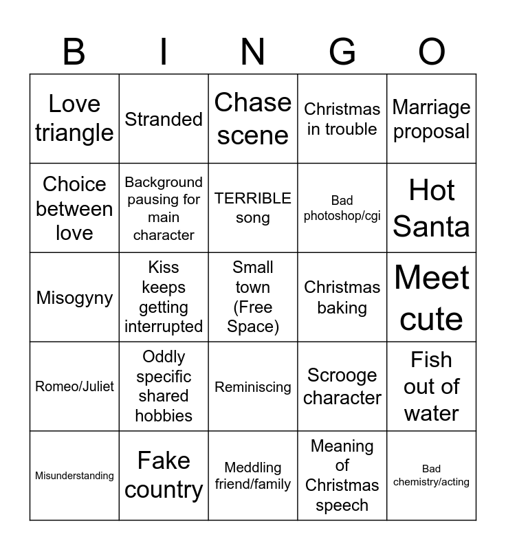 This bingo card has a free space and 53 words: Sassy friend, Bad chemistry/acting, Santa relative, Meaning of Christmas speech, Oddly specific shared hobbies, Dead relative, Stranded, Promotion/ project/prize, Choice between love, Impossibly attractive couple, Background pausing for main character, Production error, Fish out of water, Scrooge character, Makeover, Misunderstanding, TERRIBLE song, Christmas baking, Tree decorating, Marriage proposal, Kiss keeps getting interrupted, Innuendo, Bad photoshop/cgi, Love triangle, Christmas magic, Fake country, Breakup, Obviously Christmas name, Failing business, Hot Santa, Supernatural elements, Renovation/ restoration, Crazy relatives, Workaholic, Christmas classics reference, North pole scene, Christmas in trouble, Meddling friend/family, Chase scene, Exotic location, Puns, Bad extras, Meet cute, Coincidental, Stereotypes, Reminiscing, Who is this??, Bad accent, Misogyny, Romeo/Juliet, Childhood friends, Christmas change of heart and No kiss til end.