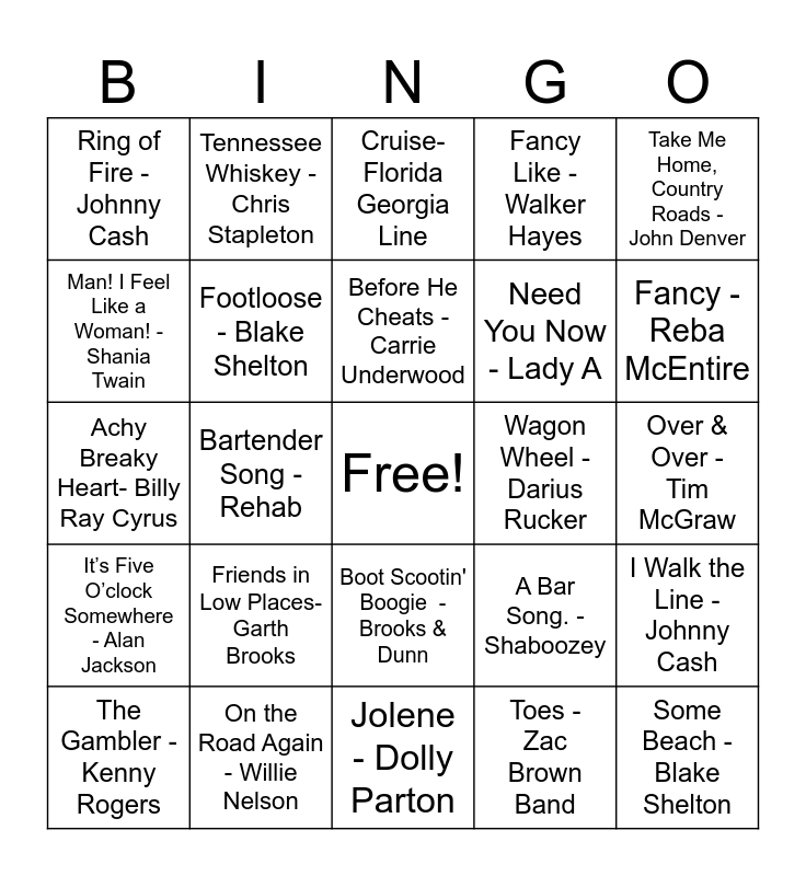 This bingo card has a free space and 25 words: Friends in Low Places- Garth Brooks, Jolene - Dolly Parton, Before He Cheats - Carrie Underwood, The Gambler - Kenny Rogers, Take Me Home, Country Roads - John Denver, Ring of Fire - Johnny Cash, Man! I Feel Like a Woman! - Shania Twain, Tennessee Whiskey - Chris Stapleton, Wagon Wheel - Darius Rucker, Boot Scootin' Boogie - Brooks & Dunn, Need You Now - Lady A, Achy Breaky Heart- Billy Ray Cyrus, A Bar Song. - Shaboozey, I Walk the Line - Johnny Cash, Footloose - Blake Shelton, 9 to 5 - Dolly Parton, Over & Over - Tim McGraw, Cruise- Florida Georgia Line, Fancy - Reba McEntire, Bartender Song - Rehab, Some Beach - Blake Shelton, On the Road Again - Willie Nelson, It’s Five O’clock Somewhere - Alan Jackson, Fancy Like - Walker Hayes and Toes - Zac Brown Band.