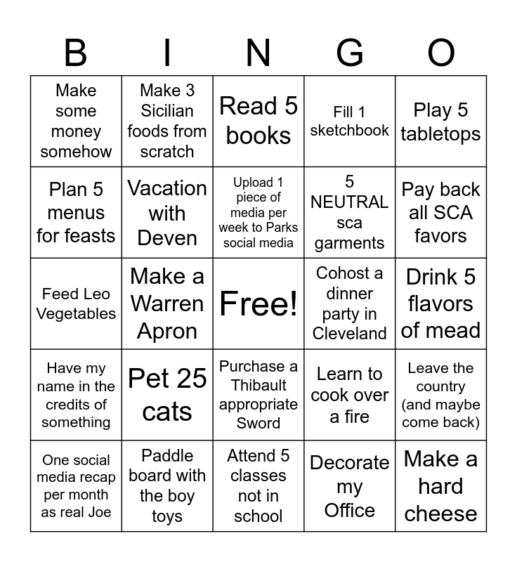This bingo card has a free space and 24 words: Pet 25 cats, Paddle board with the boy toys, Upload 1 piece of media per week to Parks social media, One social media recap per month as real Joe, Play 5 tabletops, Make some money somehow, Plan 5 menus for feasts, Make 3 Sicilian foods from scratch, Cohost a dinner party in Cleveland, Purchase a Thibault appropriate Sword, 5 NEUTRAL sca garments, Feed Leo Vegetables, Learn to cook over a fire, Leave the country (and maybe come back), Vacation with Deven, Decorate my Office, Drink 5 flavors of mead, Read 5 books, Pay back all SCA favors, Make a Warren Apron, Make a hard cheese, Have my name in the credits of something, Fill 1 sketchbook and Attend 5 classes not in school.