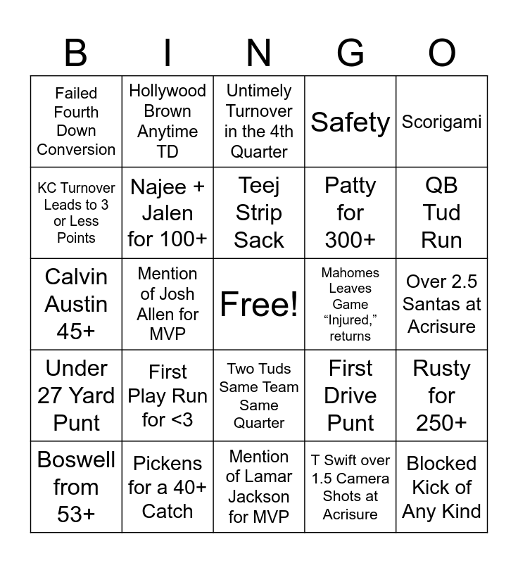 This bingo card has a free space and 24 words: First Play Run for <3, Pickens for a 40+ Catch, Teej Strip Sack, Boswell from 53+, Scorigami, Failed Fourth Down Conversion, KC Turnover Leads to 3 or Less Points, Hollywood Brown Anytime TD, Mahomes Leaves Game “Injured,” returns, Two Tuds Same Team Same Quarter, Patty for 300+, Calvin Austin 45+, First Drive Punt, Rusty for 250+, Najee + Jalen for 100+, T Swift over 1.5 Camera Shots at Acrisure, Over 2.5 Santas at Acrisure, Untimely Turnover in the 4th Quarter, QB Tud Run, Mention of Josh Allen for MVP, Blocked Kick of Any Kind, Under 27 Yard Punt, Safety and Mention of Lamar Jackson for MVP.