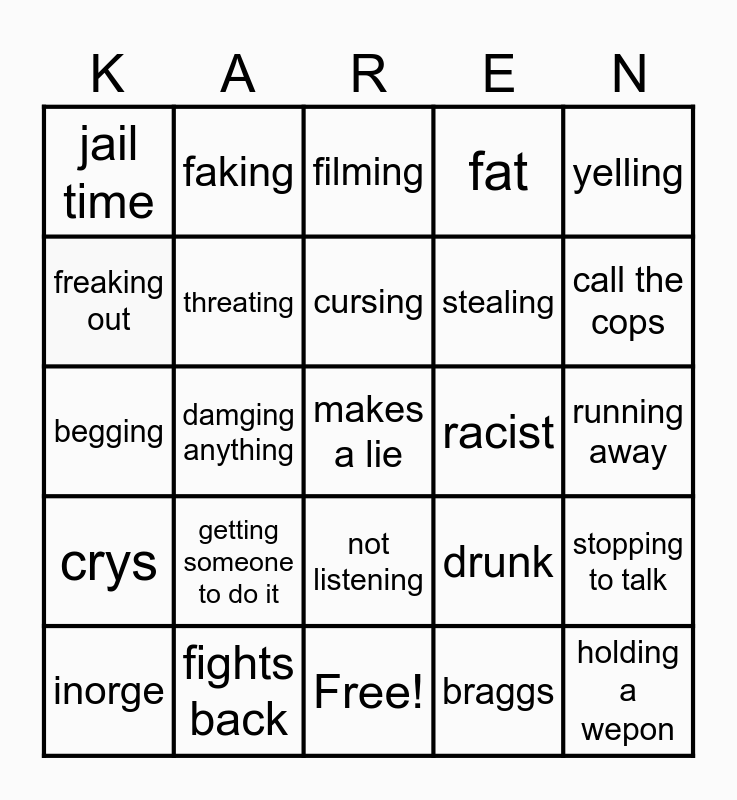 This bingo card has 25 words: crys, fights back, makes a lie, braggs, yelling, jail time, faking, filming, racist, stopping to talk, freaking out, threating, Free!, drunk, call the cops, inorge, damging anything, cursing, stealing, running away, begging, getting someone to do it, not listening, fat and holding a wepon.