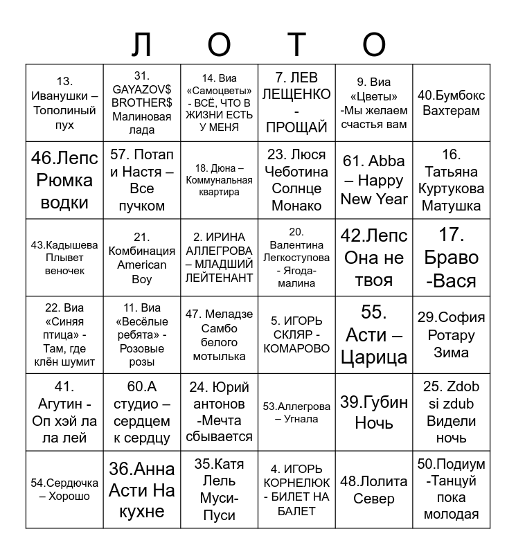 This bingo card has 70 words: 1. Ф. Киркоров - Дива, 2. ИРИНА АЛЛЕГРОВА – МЛАДШИЙ ЛЕЙТЕНАНТ, 3. ЭДИТА ПЬЕХА - НАШ СОСЕД, 4. ИГОРЬ КОРНЕЛЮК - БИЛЕТ НА БАЛЕТ, 5. ИГОРЬ СКЛЯР - КОМАРОВО, 6. КОМБИНАЦИЯ - БУХГАЛТЕР, 7. ЛЕВ ЛЕЩЕНКО - ПРОЩАЙ, 8. Надежда Кадышева - Виновата ли я, 9. Виа «Цветы» -Мы желаем счастья вам, 10. Т. Овсиенко За розовым морем, 11. Виа «Весёлые ребята» - Розовые розы, 12. Земляне - Трава у дома, 13. Иванушки – Тополиный пух, 14. Виа «Самоцветы» - ВСЁ, ЧТО В ЖИЗНИ ЕСТЬ У МЕНЯ, 15. Жандаурен Аблаев - Дарите женщинам цветы, 16. Татьяна Куртукова Матушка, 17. Браво -Вася, 18. Дюна –Коммунальная квартира, 19. Мираж - Музыка нас связала, 20. Валентина Легкоступова - Ягода-малина, 21. Комбинация American Boy, 22. Виа «Синяя птица» - Там, где клён шумит, 23. Люся Чеботина Солнце Монако, 24. Юрий антонов -Мечта сбывается, 25. Zdob si zdub Видели ночь, 26. Вахбет Абедов - Водка Пиво, 27.Стас Михайлов Все для тебя, 28.Губин Девушки как звезды, 29.София Ротару Зима, 30. Меладзе Иностранец, 31. GAYAZOV$ BROTHER$ Малиновая лада, 32.Нина Бродская – Звенит Январская вьюга, 33.Меладзе Красиво, 34.Шуфутинский Марджанджа, 35.Катя Лель Муси-Пуси, 36.Анна Асти На кухне, 37.Лолита На титанике, 38.Дискотека Авария Новогодняя, 39.Губин Ночь, 40.Бумбокс Вахтерам, 41. Агутин - Оп хэй ла ла лей, 42.Лепс Она не твоя, 43.Кадышева Плывет веночек, 44.Асти По барам, 45.Успенская По полюшку, 46.Лепс Рюмка водки, 47. Меладзе Самбо белого мотылька, 48.Лолита Север, 49.Стас Михайлов Сердце из золота, 50.Подиум -Танцуй пока молодая, 51. The Hetters -Танцы, 52.Лобода Твои глаза, 53.Аллегрова – Угнала, 54.Сердючка – Хорошо, 55. Асти – Царица, 56. Нэнси – Я тебя нарисовал, 57. Потап и Настя – Все пучком, 58.Ляпис Трубецкой – Ау, 59.Руки вверх – А он тебя целует, 60.А студио – сердцем к сердцу, 61. Abba – Happy New Year, 62. Бандерос – Про красивую жизнь, 63.М. Боярский – Зеленоглазое такси, 64.Bon Jovi – Its my life, 65. George Michael – Last Christmas, 66. Игорь Николаев – Такси, 67. NILETTO –Любимка, 68.Отпетые Мошенники – Люби меня люби, 69. 2 Маши – Я к тебе босая and 70. Руки вверх – Крошка моя.