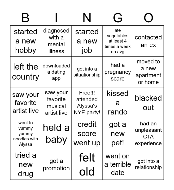 This bingo card has a free space and 24 words: held a baby, got a promotion, got into a situationship, tried a new drug, contacted an ex, started a new hobby, left the country, diagnosed with a mental illness, kissed a rando, credit score went up, had a pregnancy scare, saw your favorite artist live, got a new pet!, had an unpleasant CTA experience, downloaded a dating app, went on a terrible date, blacked out, started a new job, moved to a new apartment or home, saw your favorite musical artist live, got into a relationship, went to yummy yummy noodles with Alyssa, ate vegetables at least 4 times a week on avg and felt old.