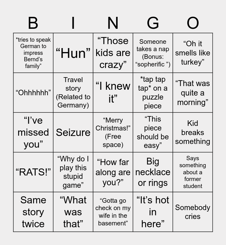 This bingo card has a free space and 24 words: “Why do I play this stupid game”, “What was that”, “I knew it”, Same story twice, “Oh it smells like turkey”, *tries to speak German to impress Bernd’s family”, “Ohhhhhh”, “Hun”, “This piece should be easy”, “How far along are you?”, *tap tap tap* on a puzzle piece, “I’ve missed you”, Big necklace or rings, Says something about a former student, Travel story (Related to Germany), “It’s hot in here”, Kid breaks something, “Those kids are crazy”, “That was quite a morning”, Seizure, Somebody cries, “RATS!”, Someone takes a nap (Bonus: “sopherific ”) and “Gotta go check on my wife in the basement”.