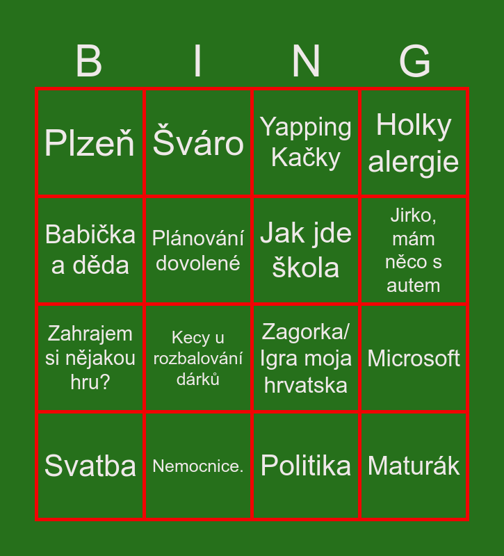 This bingo card has 16 words: Nemocnice., Microsoft, Yapping Kačky, Plzeň, Zahrajem si nějakou hru?, Šváro, Zagorka/ Igra moja hrvatska, Politika, Babička a děda, Plánování dovolené, Svatba, Holky alergie, Kecy u rozbalování dárků, Jirko, mám něco s autem, Jak jde škola and Maturák.