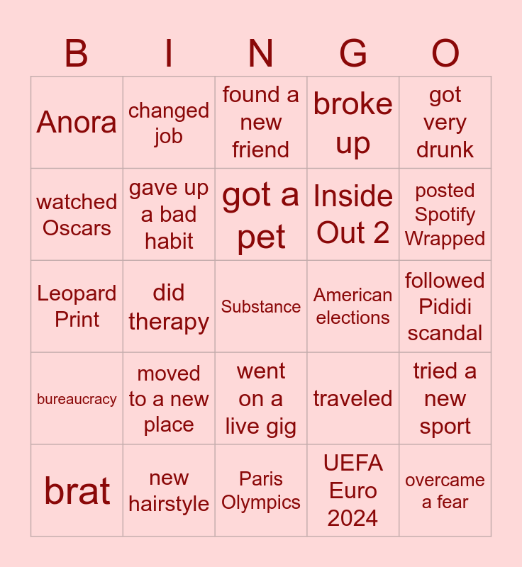 This bingo card has a free space and 24 words: brat, moved to a new place, got a pet, UEFA Euro 2024, got very drunk, Anora, changed job, found a new friend, American elections, followed Pididi scandal, Leopard Print, gave up a bad habit, traveled, tried a new sport, watched Oscars, new hairstyle, Paris Olympics, broke up, posted Spotify Wrapped, bureaucracy, did therapy, went on a live gig, Inside Out 2 and overcame a fear.
