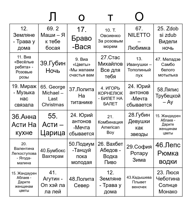 This bingo card has 86 words: 56. Нэнси – Я тебя нарисовал, 57. Потап и Настя – Все пучком, 58.Ляпис Трубецкой – Ау, 59.Руки вверх – А он тебя целует, 60.А студио – сердцем к сердцу, 61. Abba – Happy New Year, 62. Бандерос – Про красивую жизнь, 50.Подиум -Танцуй пока молодая, 51. The Hetters -Танцы, 52.Лобода Твои глаза, 53.Аллегрова – Угнала, 54.Сердючка – Хорошо, 55. Асти – Царица, 37.Лолита На титанике, 38.Дискотека Авария Новогодняя, 39.Губин Ночь, 40.Бумбокс Вахтерам, 41. Агутин - Оп хэй ла ла лей, 42.Лепс Она не твоя, 43.Кадышева Плывет веночек, 44.Асти По барам, 12. Земляне - Трава у дома, 13. Иванушки – Тополиный пух, 14. Виа «Самоцветы» - ВСЁ, ЧТО В ЖИЗНИ ЕСТЬ У МЕНЯ, 15. Жандаурен Аблаев - Дарите женщинам цветы, 16. Татьяна Куртукова Матушка, 17. Браво -Вася, 18. Дюна –Коммунальная квартира, 19. Мираж - Музыка нас связала, 20. Валентина Легкоступова - Ягода-малина, 21. Комбинация American Boy, 22. Виа «Синяя птица» - Там, где клён шумит, 23. Люся Чеботина Солнце Монако, 24. Юрий антонов -Мечта сбывается, 25. Zdob si zdub Видели ночь, 26. Вахбет Абедов - Водка Пиво, 27.Стас Михайлов Все для тебя, 45.Успенская По полюшку, 46.Лепс Рюмка водки, 47. Меладзе Самбо белого мотылька, 48.Лолита Север, 63.М. Боярский – Зеленоглазое такси, 64.Bon Jovi – Its my life, 65. George Michael – Last Christmas, 66. Игорь Николаев – Такси, 67. NILETTO –Любимка, 68.Отпетые Мошенники – Люби меня люби, 69. 2 Маши – Я к тебе босая, 70. Руки вверх – Крошка моя, 1. Ф. Киркоров - Дива, 2. ИРИНА АЛЛЕГРОВА – МЛАДШИЙ ЛЕЙТЕНАНТ, 3. ЭДИТА ПЬЕХА - НАШ СОСЕД, 4. ИГОРЬ КОРНЕЛЮК - БИЛЕТ НА БАЛЕТ, 5. ИГОРЬ СКЛЯР - КОМАРОВО, 6. КОМБИНАЦИЯ - БУХГАЛТЕР, 7. ЛЕВ ЛЕЩЕНКО - ПРОЩАЙ, 8. Надежда Кадышева - Виновата ли я, 9. Виа «Цветы» -Мы желаем счастья вам, 10. Т. Овсиенко За розовым морем, 11. Виа «Весёлые ребята» - Розовые розы, 12. Земляне - Трава у дома, 13. Иванушки – Тополиный пух, 14. Виа «Самоцветы» - ВСЁ, ЧТО В ЖИЗНИ ЕСТЬ У МЕНЯ, 15. Жандаурен Аблаев - Дарите женщинам цветы, 16. Татьяна Куртукова Матушка, 17. Браво -Вася, 18. Дюна –Коммунальная квартира, 19. Мираж - Музыка нас связала, 20. Валентина Легкоступова - Ягода-малина, 21. Комбинация American Boy, 22. Виа «Синяя птица» - Там, где клён шумит, 23. Люся Чеботина Солнце Монако, 24. Юрий антонов -Мечта сбывается, 25. Zdob si zdub Видели ночь, 26. Вахбет Абедов - Водка Пиво, 27.Стас Михайлов Все для тебя, 28.Губин Девушки как звезды, 29.София Ротару Зима, 30. Меладзе Иностранец, 31. GAYAZOV$ BROTHER$ Малиновая лада, 32.Нина Бродская – Звенит Январская вьюга, 33.Меладзе Красиво, 34.Шуфутинский Марджанджа, 35.Катя Лель Муси-Пуси, 36.Анна Асти На кухне and 49.Стас Михайлов Сердце из золота.