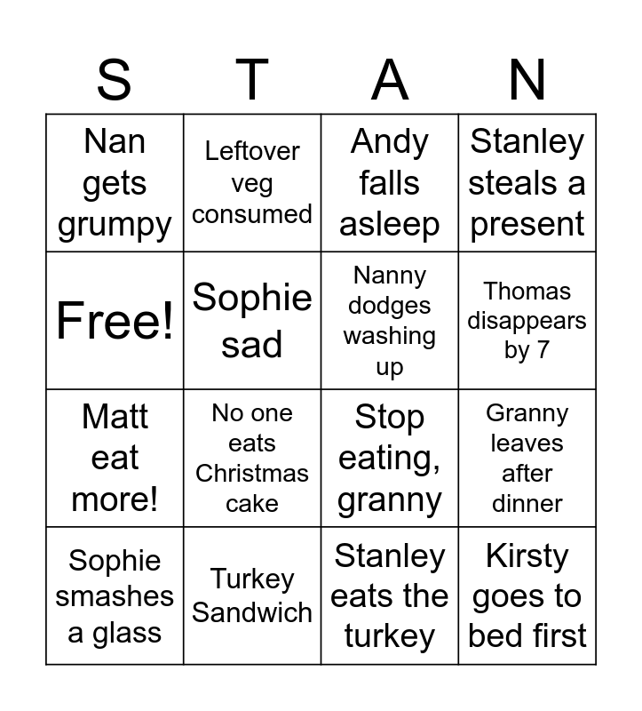 This bingo card has 16 words: Turkey Sandwich, Granny leaves after dinner, Andy falls asleep, Nan gets grumpy, Matt eat more!, Leftover veg consumed, Stop eating, granny, Stanley eats the turkey, Free!, Sophie sad, Sophie smashes a glass, Stanley steals a present, No one eats Christmas cake, Thomas disappears by 7, Nanny dodges washing up and Kirsty goes to bed first.