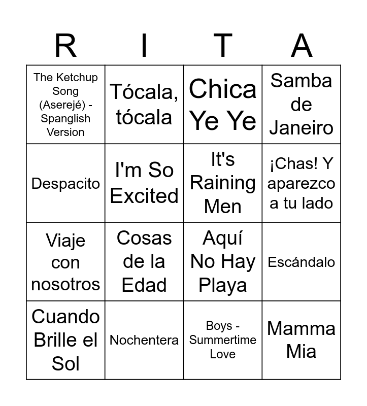 This bingo card has 48 words: Free!, I'm So Excited, Barbie Girl, Mamma Mia, Wannabe, Dancing Queen, It's Raining Men, Macarena, The Ketchup Song (Aserejé) - Spanglish Version, La Camisa Negra, Boys - Summertime Love, Samba de Janeiro, Bamboléo, Felicità, Danza Kuduro, Amigos para Siempre, Despacito, Cosas de la Edad, Mil Calles Llevan Hacia Ti, ¡Chas! Y aparezco a tu lado, Cuando Brille el Sol, Sabor de amor - Versión 1988, Chica Ye Ye, Escándalo, Eloise, Tócala, tócala, Yo Quiero Bailar, A quién le importa, Resistiré, Mi Limon, Mi Limonero, El Toro Guapo, Marta, Sebas, Guille y los demás, A-Ba-Ni-Bi, Salta!!!, Cuando zarpa el amor, Antes Muerta Que Sencilla, A quién le importa (versión), Nochentera, Potra Salvaje, Maquillaje, Sera Porque Te Amo, La Parranda: Canto a Murcia, Aquí No Hay Playa, Ob-La-Di, Ob-La-Da - Remastered 2009, Viaje con nosotros, Sarandonga, Que La Detengan and Losing My Religion.
