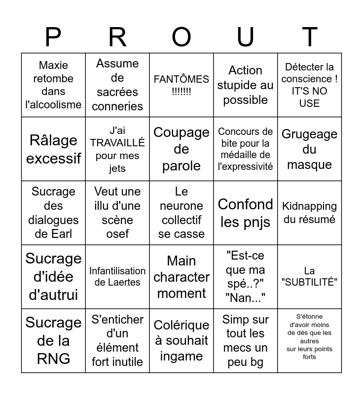 This bingo card has a free space and 35 words: Demande à répéter 5 sec après, Déclaration gênante, Sucrage des jets de Laertes, J'ai TRAVAILLÉ pour mes jets, Main character moment, Action stupide au possible, Râlage excessif, Interprétation illogique, Coupage de parole, Aucun sens de la préservation de soi, Sucrage des dialogues de Earl, Détecter la conscience ! IT'S NO USE, Entraîne Synflu dans un plan q, Proposition Chaotic Evil sans raison, Maxie retombe dans l'alcoolisme, Confond les pnjs, Simp sur tout les mecs un peu bg, Veut une illu d'une scène osef, Sucrage d'idée d'autrui, S'étonne d'avoir moins de dés que les autres sur leurs points forts, "Est-ce que ma spé..?" "Nan...", Sucrage de la RNG, La "SUBTILITÉ", S'enticher d'un élément fort inutile, FANTÔMES !!!!!!!, Grugeage du masque, Condescendance, Pense que son esprit est dans la tête des autres; Est dans son propre cul en fait, Concours de bite pour la médaille de l'expressivité, Kidnapping du résumé, Pense que tout le monde est son ami, Colérique à souhait ingame, Infantilisation de Laertes, Assume de sacrées conneries and Gentillesse déplacée.