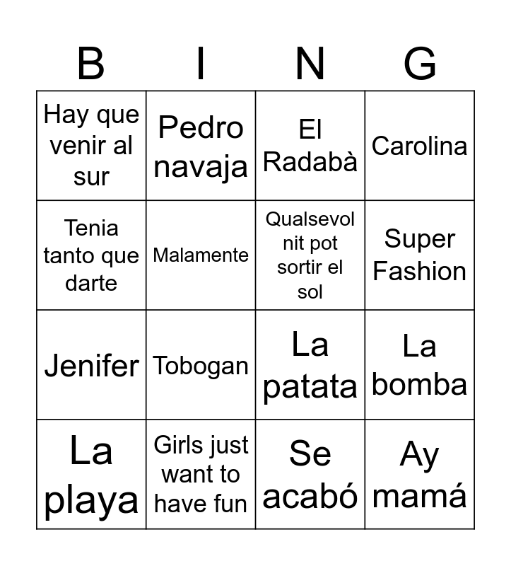 This bingo card has 67 words: Paraules d'amor, La revolución sexual, Mamma mia, Que la detengan, Marta, Sebas, Guille y los demás, Besos, Pedro navaja, Ave María, Super Fashion, Milionària, Wannabe, Como camarón, Se acabó, Tenia tanto que darte, I want to break free, Malamente, La bomba, Hay que venir al sur, Fum, fum, fum, Jenifer, Thriller, Ay mamá, Carolina, L'estaca, Al mar!, Al vent, Escándalo, Amante bandido, Tobogan, No dudaria, La playa, La flaca, Bailoteo, Chica yeye, YMCA, Dancing queen, Bon dia, Puedes contar conmigo, La patata, Coti x coti, Aserejé, Qualsevol nit pot sortir el sol, Girls just want to have fun, El muerto vivo, Como una ola, Mambo no.5, Boig per tu, Mi gran noche, Supermercat, Chiquitita, El Radabà, Por la raja de tu falda, Devuélveme a mi chica, A quién le importa, La marina està morena, Un beso y una flor, Sweet Caroline, Soldadito marinero, Me colé en una fiesta, Los peces en el río, Baby one more time, Cuando tú vas, Roxanne, Yo quiero bailar, Antes muerta que sencilla, Mi burrito sabanero and Rosas.